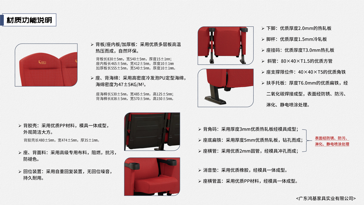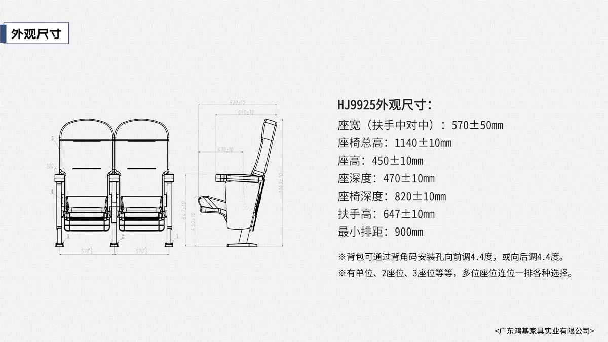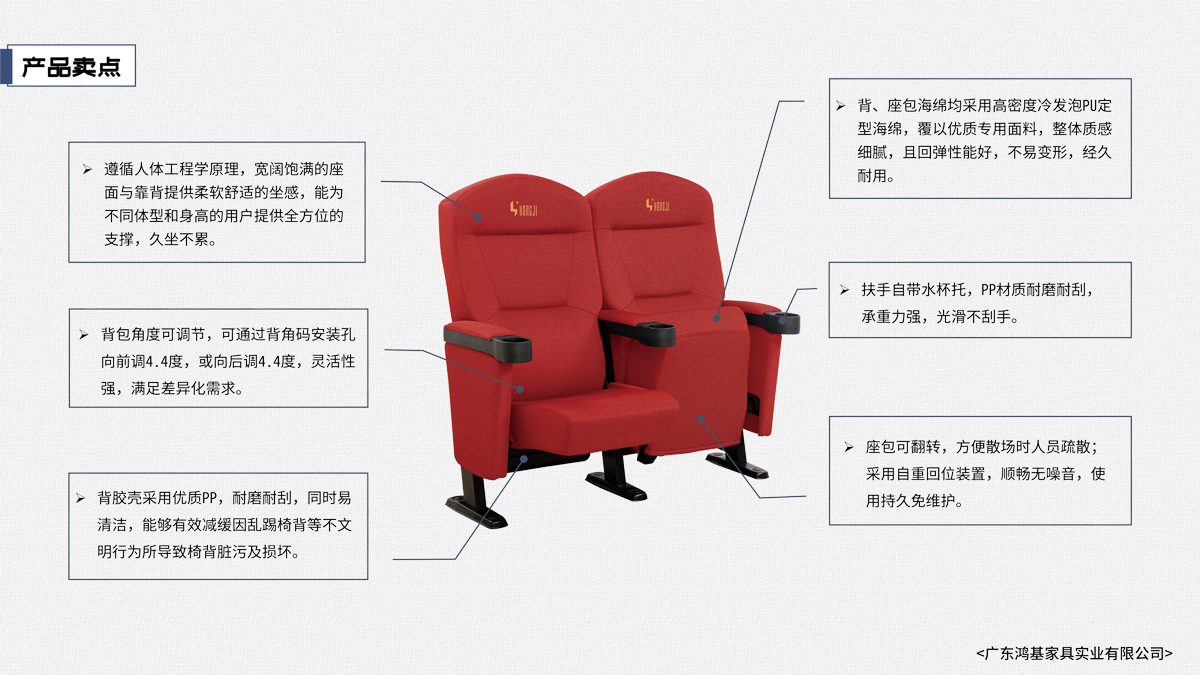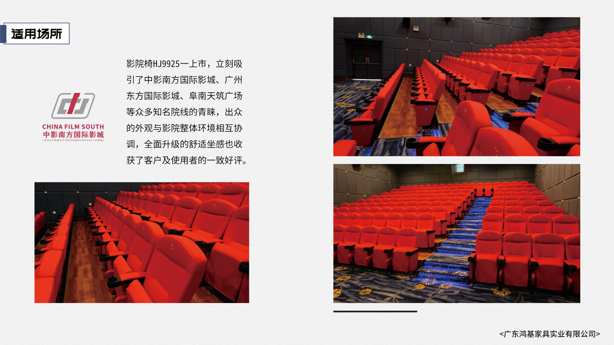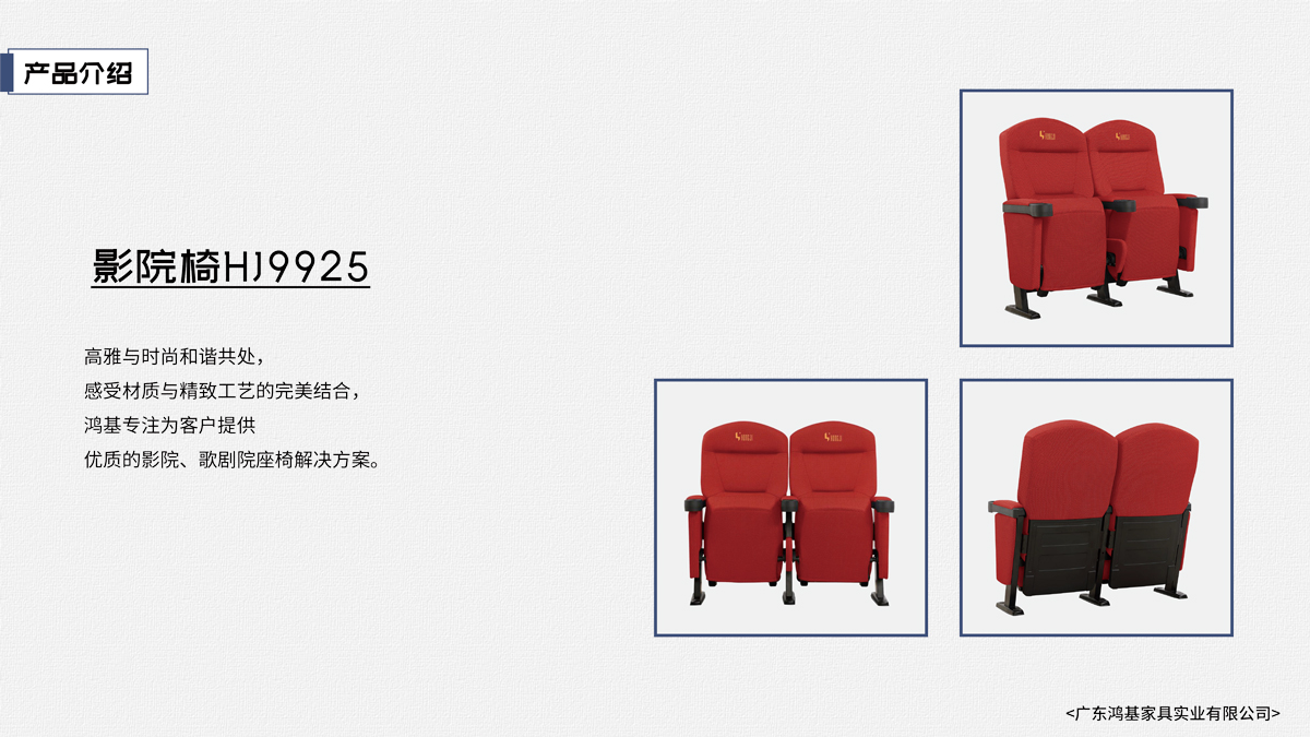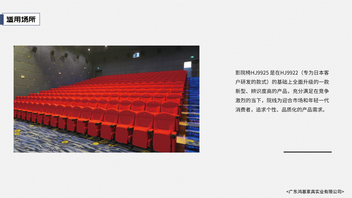該座椅的設(shè)計(jì)已獲國(guó)家外觀設(shè)計(jì)專利,座椅座感舒適,符合人體工程學(xué)原理,安裝、維修方便。采用高檔柔性面料和高密度超軟PU冷發(fā)泡定型海綿,座椅整體造型外觀飽滿,精致大方。可為影院、禮堂、歌劇院等最佳首選之一。 |